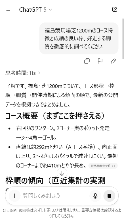 ChatGPTに「○○競馬場○○mのコース特徴と成績の良い枠、好走する脚質を徹底的に調べてください」と入力します。