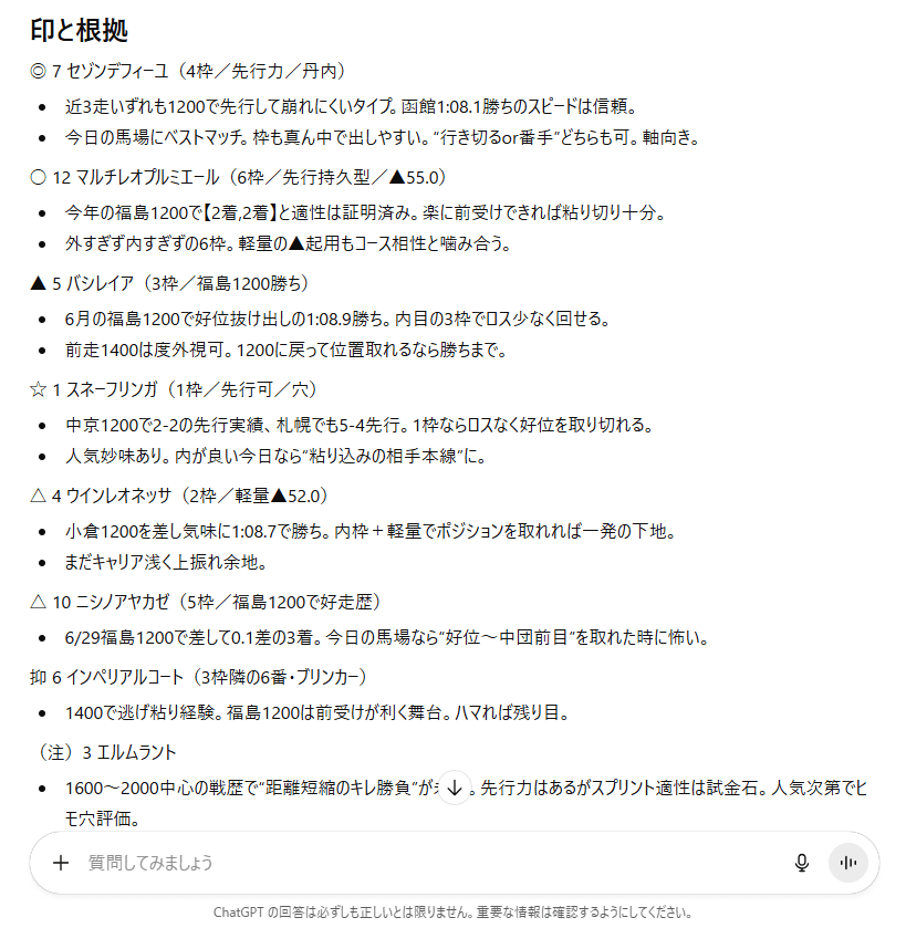 この現象から、ChatGPTは馬名を理解しているのではなく、特定の馬名とその実績を紐づけて論理的に予想していることがわかります。