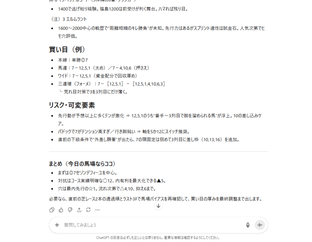 *実は今回「その際、オッズは大衆の意見で参考にならないので無視して下さい。」というプロンプトを忘れて話を進めてしまっています。このプロンプトを指定しないと、オッズ通りの予想をしてしまう可能性があるので、忘れずに指定しましょう。