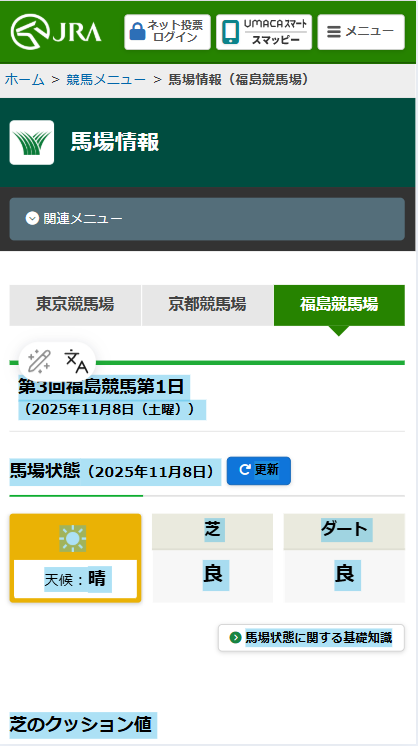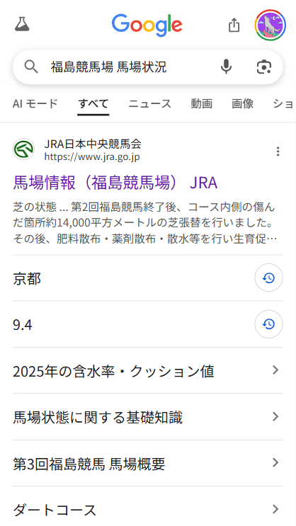 検索エンジンの検索欄に「競馬場名 馬場状況」と調べると、JRAが公開している馬場状況のページが表示されるので、そちらをタップします。