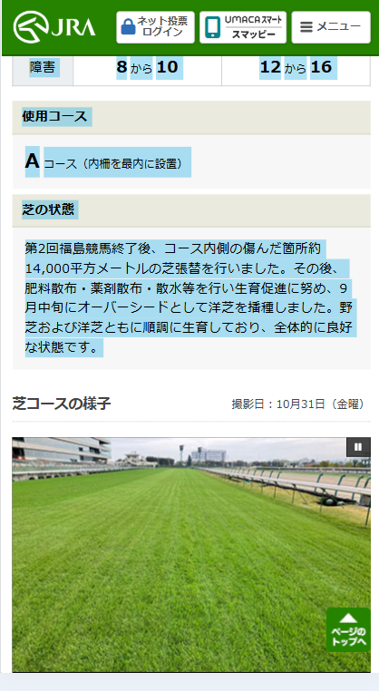馬場状態の内容をコピーします。コピーする範囲は「○○競馬場第〇日」から「芝の状態」までです。