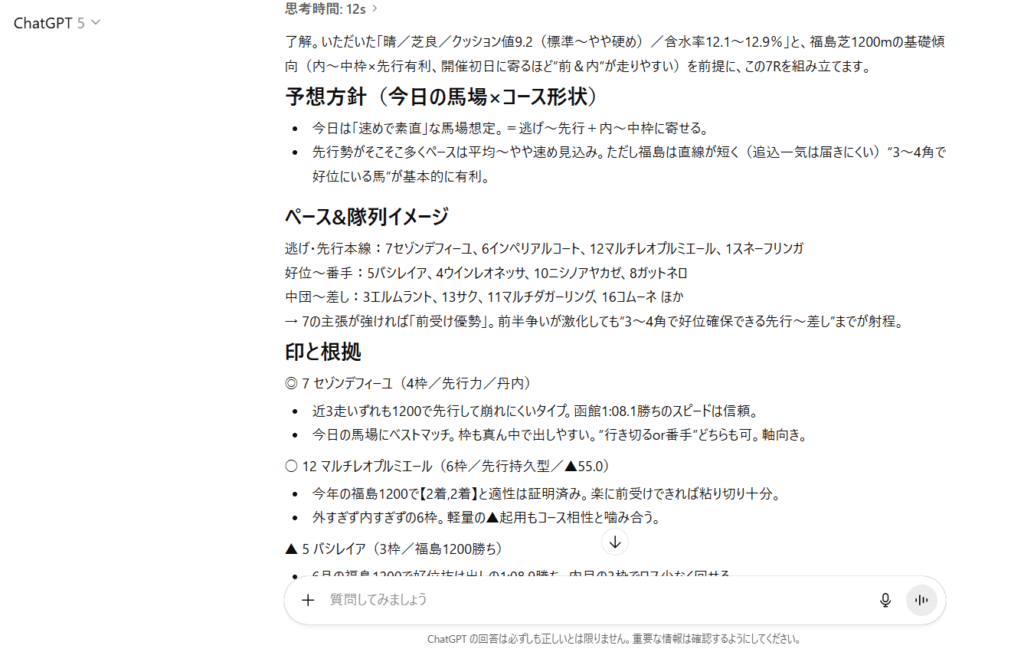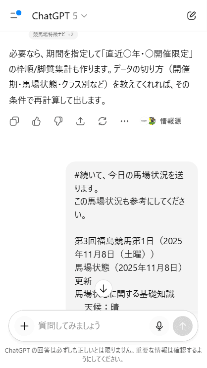 すると、ChatGPTが指示に従って枠順やコースの傾向を出してくれます。続いて、予想する競馬場の馬場状況を確認します。