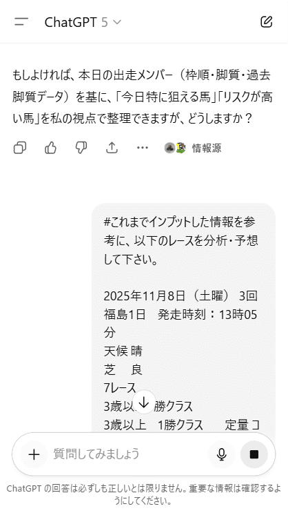 すると、先ほどのコース状況と馬場状態をChatGPTが把握してくれます。次はいよいよ、出場馬の情報を読み込んでいきます。