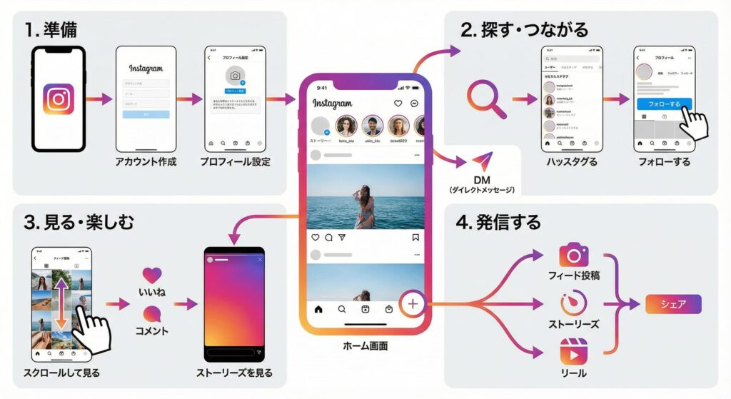 instagramの使い方についての流れを図解で作ってください