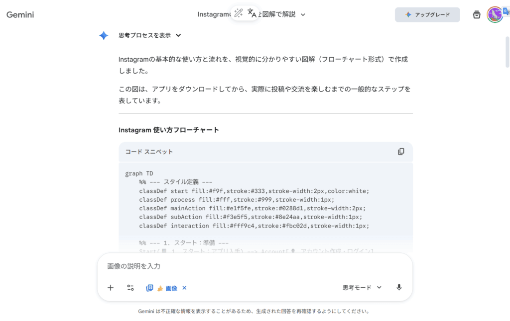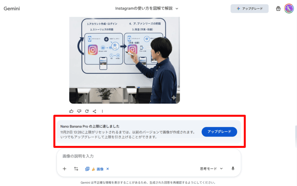 これでNano Banana Proを使う準備は整いました。あとはチャット欄に作りたい画像をテキストで指示するだけでNano Banana Proが高品質な画像を作ってくれます。