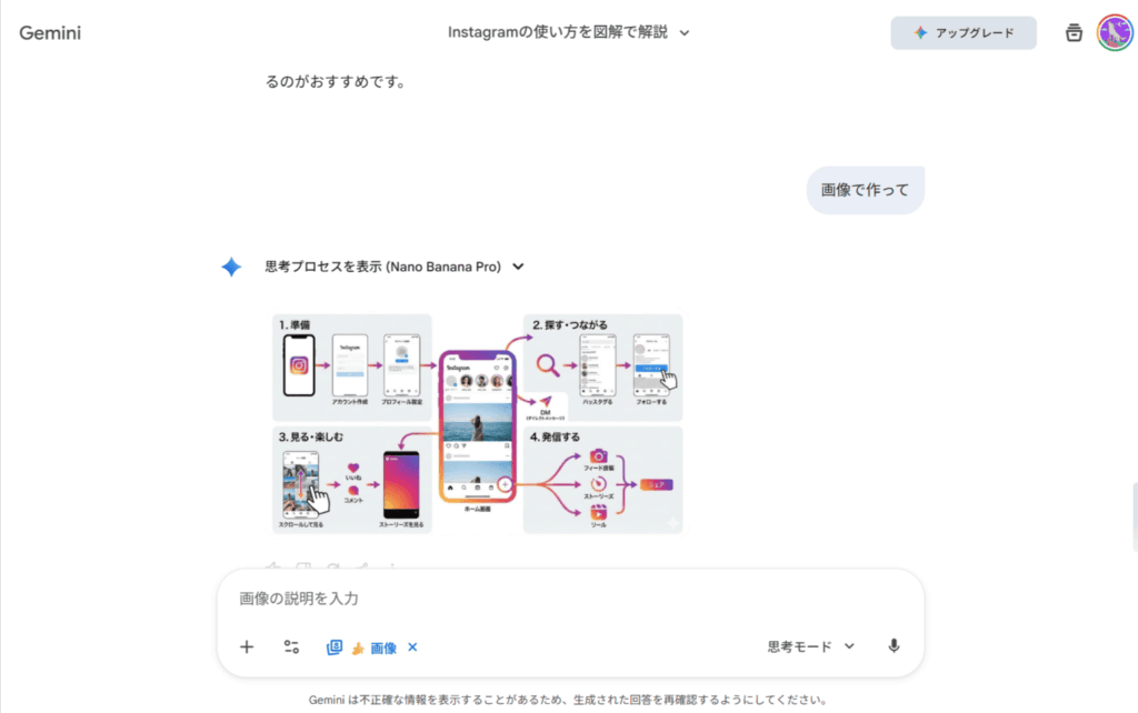 上記の手順で「画像の作成」と「思考モード」を選択したら、Nano Banana Proを使う準備は完了です。あとはチャットに作りたい画像をテキストで指示することで、Nano Banana Proが高品質な画像を作ってくれます。