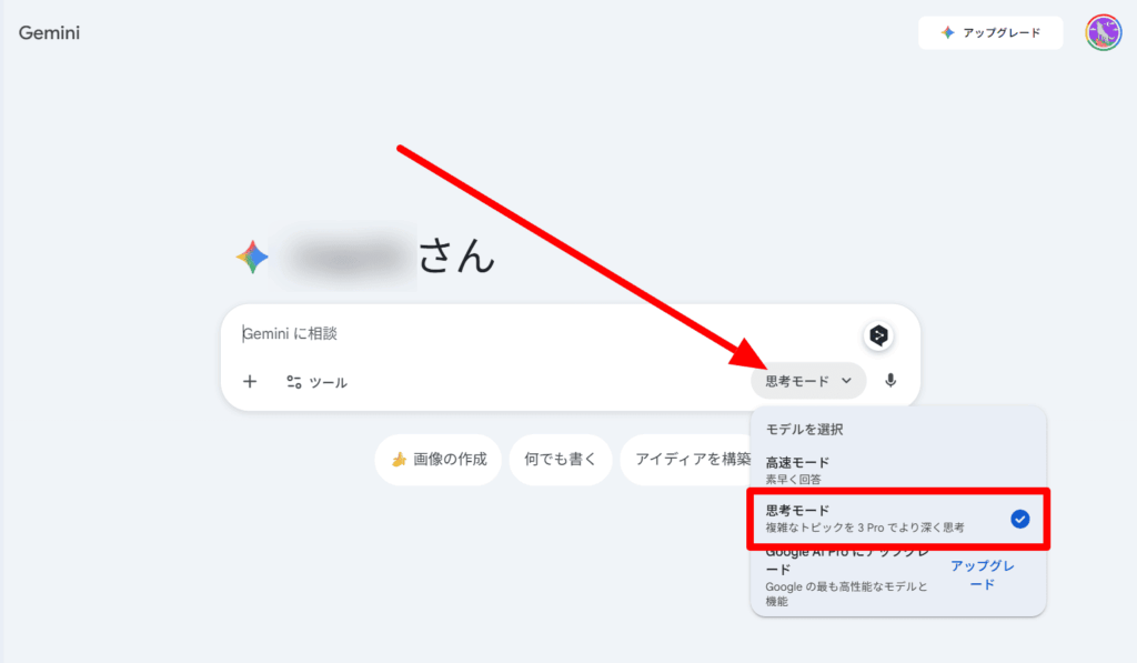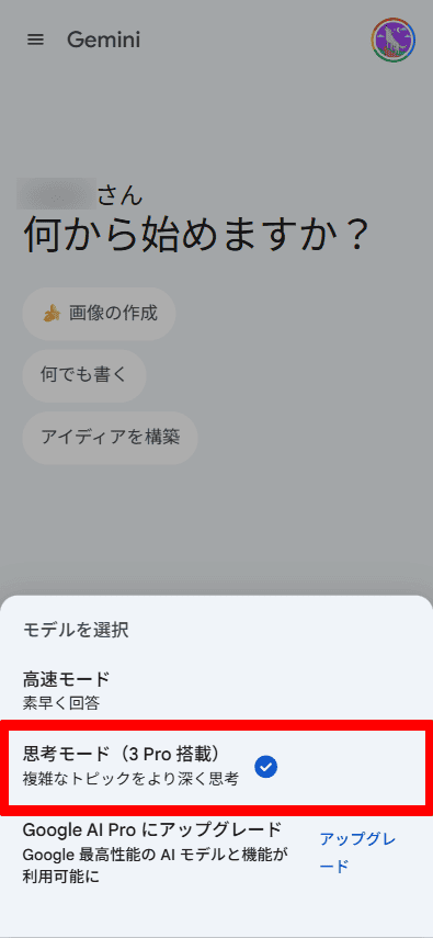 - Step.4表示内容から「思考モード(3 Pro 搭載)」をタップ