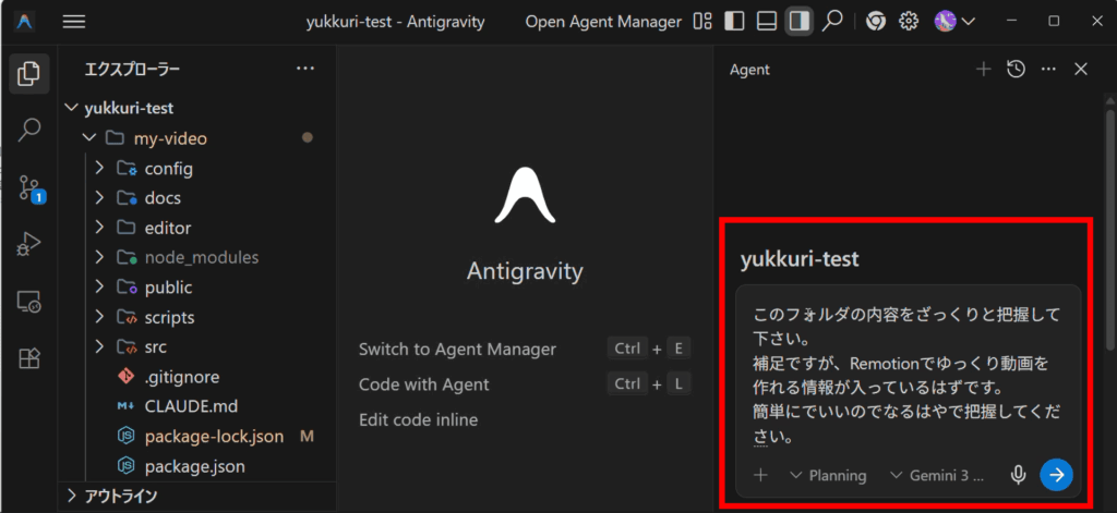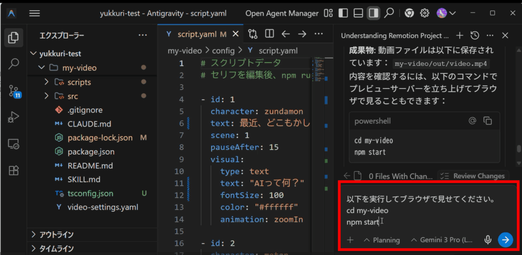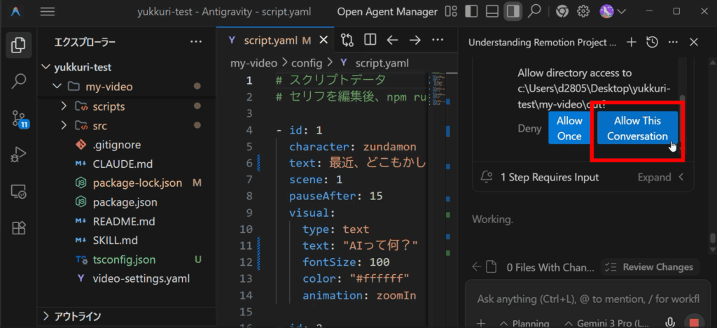 Antigravityでプロジェクトフォルダを開いてゆっくり動画を作成する