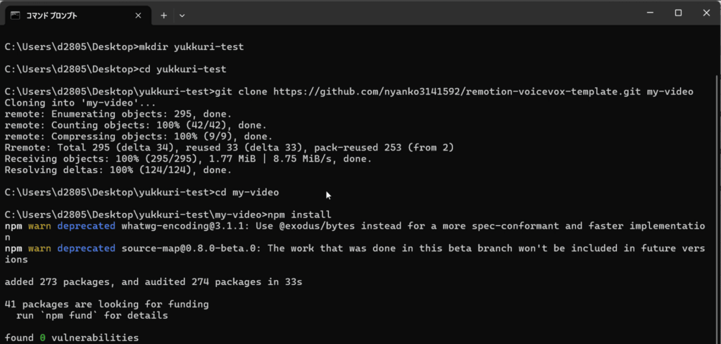 続いて、my-videoフォルダ上で以下のコマンドを実行します。