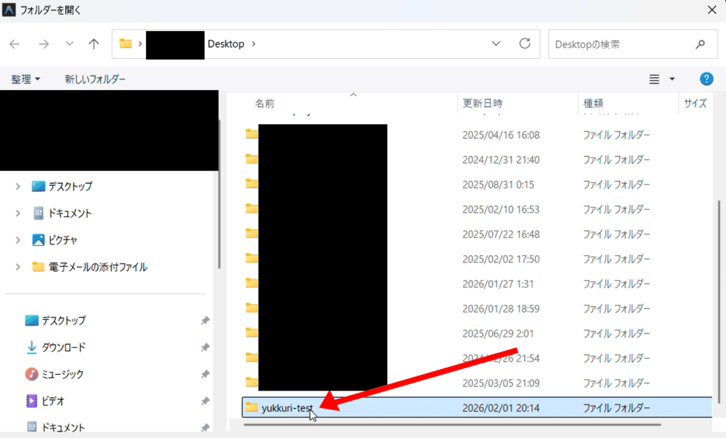 先ほど作成したプロジェクトフォルダを選択します。