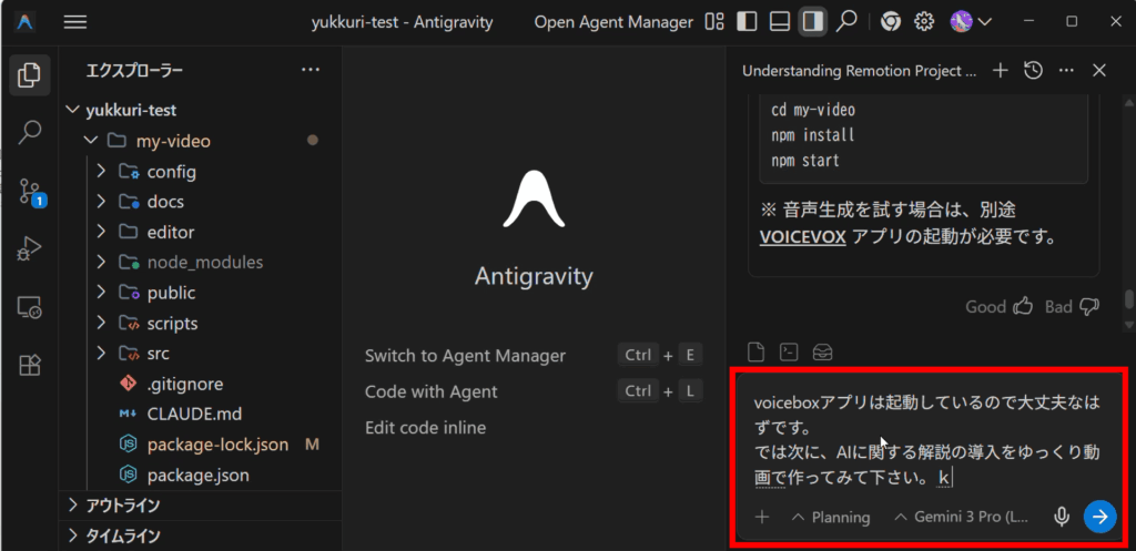 ではいよいよ、Antigravityを使て動画を生成・編集してみましょう。