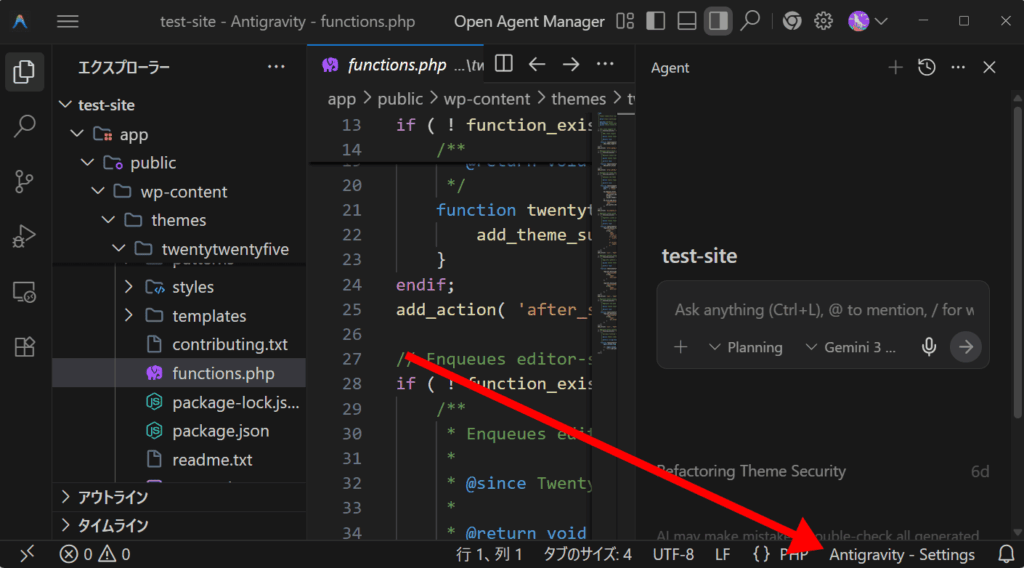 はじめにAntigravityを開き、右下にある「Antigravity – Settings」をクリックします。