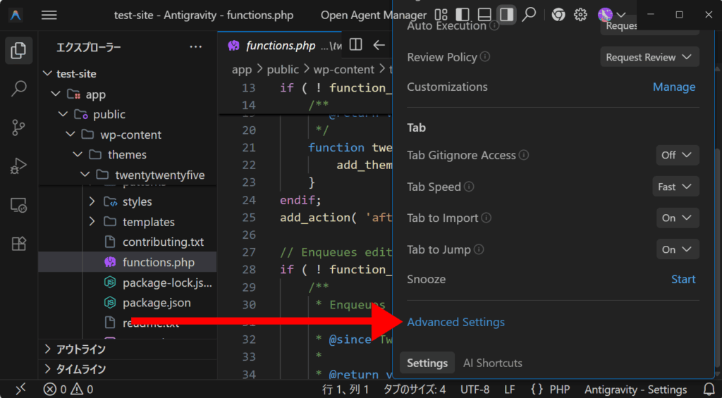 はじめにAntigravityの右下にある「Antigravity – Settings」をクリックします。