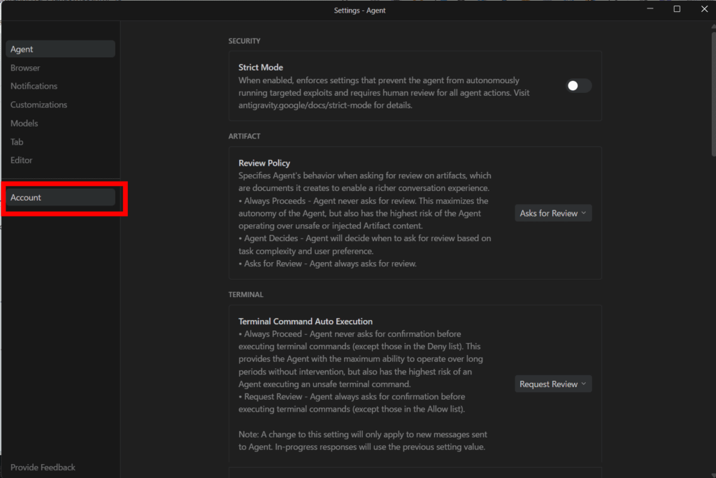 そこで本項目では「Antigravityにデータ学習させないための設定方法」と「AIの自動実行をオフにする設定」について解説します。