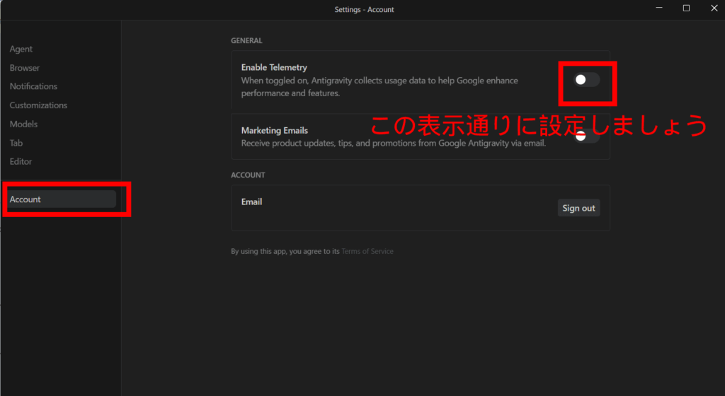 また、初期設定を誤ると、Antigravityで取り扱っているプライベートなデータをGeminiに学習される可能性もあります。