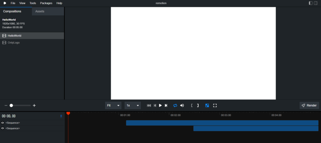 この順番で実行すると、Remotionの動画編集画面がブラウザで表示されます。