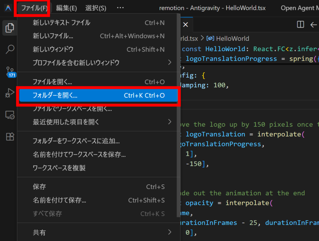 Antigravityを開いたら、左上のメニュー欄から「ファイル」→「フォルダーを開く」の順番でクリックします。