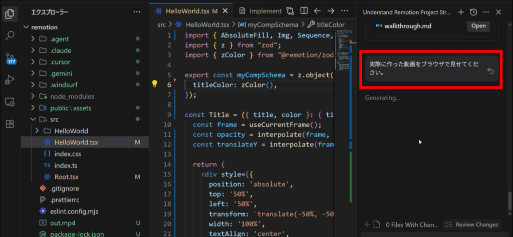 フォルダ構造を理解する処理が終わったら、Hello Worldというテンプレート動画をAIで修正してみましょう。