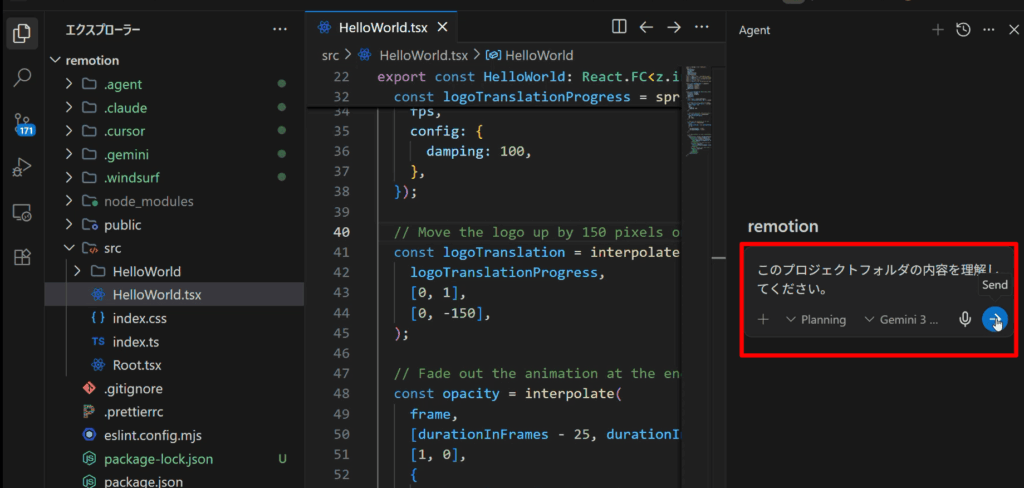 続いて、画面右にあるAIエージェントとのチャット欄に「このプロジェクトフォルダの内容を理解してください。」というプロンプトを入力・実行します。