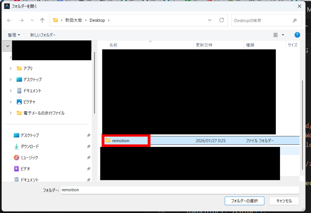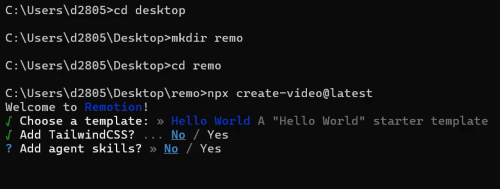 ターミナルが開いたら、Remotionに関する情報をまとめるフォルダを作ります。コマンドプロンプトで以下のコマンドを実行することで、フォルダを作成できます。