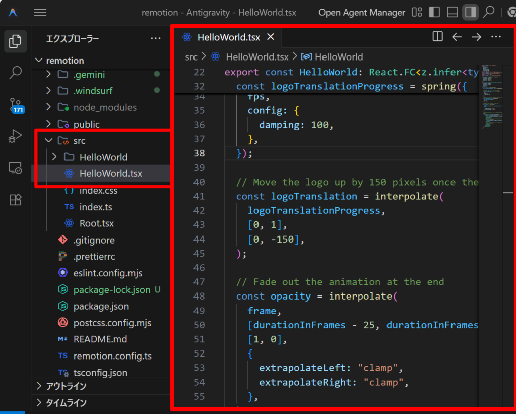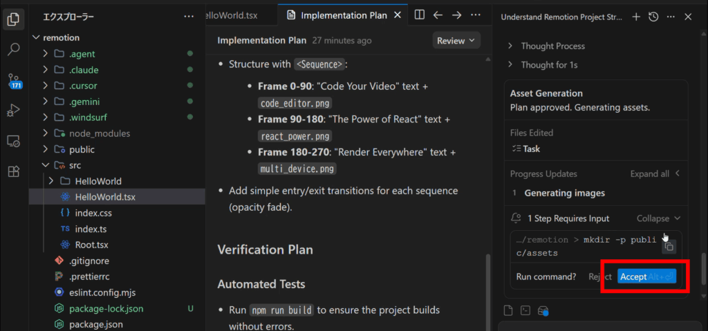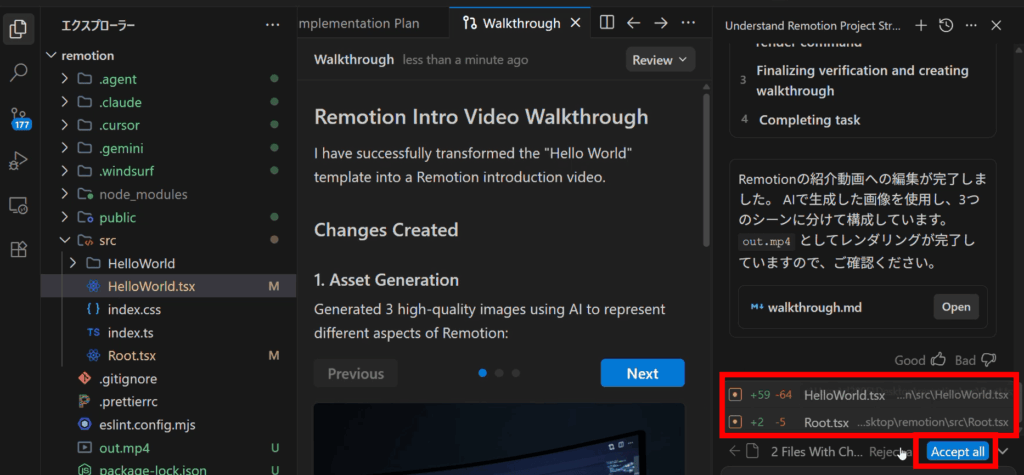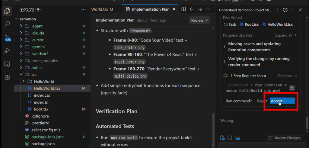これで、Antigravityが「Remotionのフォルダ構造とどこに何を配置すれば動画を生成できるのか」という構造を正確に理解できます。