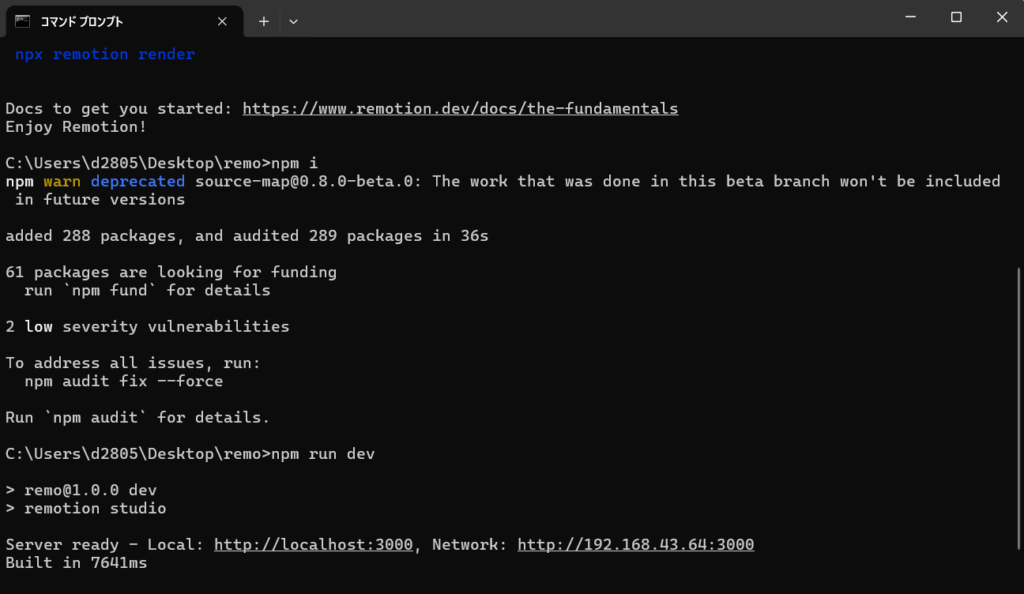 フォルダ内に移動したら、いよいよRemotionをインストールします。以下のコマンドを実行してください。