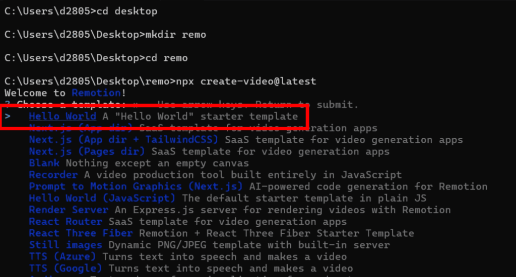 ありがとうございます。 現在はHello Worldにスターターテンプレートがあるかと思います。そのテンプレートの動画を、Remotionの紹介動画に編集してみて下さい。 nano bananaを使って適時最適な画像を生成してください。