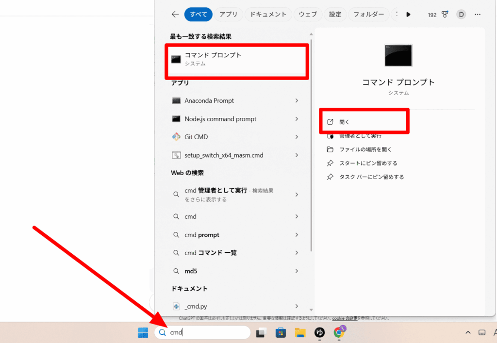 Windowsの場合は、検索欄に「cmd」と入力して開きます。Macの場合は「ターミナル」と入力してみて下さい。