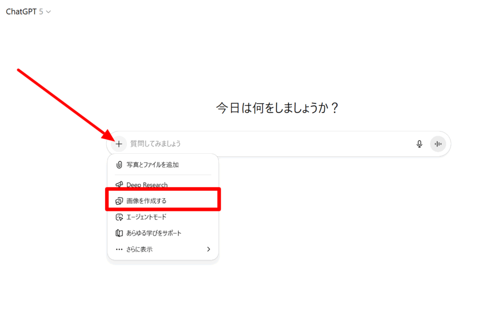 その際、チャット欄の左にある「+」をクリックし、表示内容から「画像を作成する」アイコンをクリックすることがおすすめです。