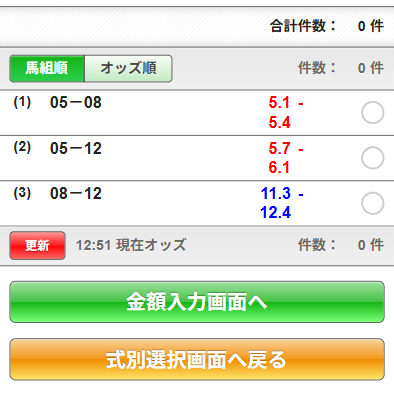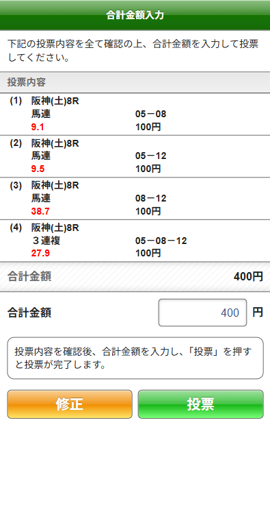 あと、本線である5-12-8の3連複1点を含めて合計4点購入しました!