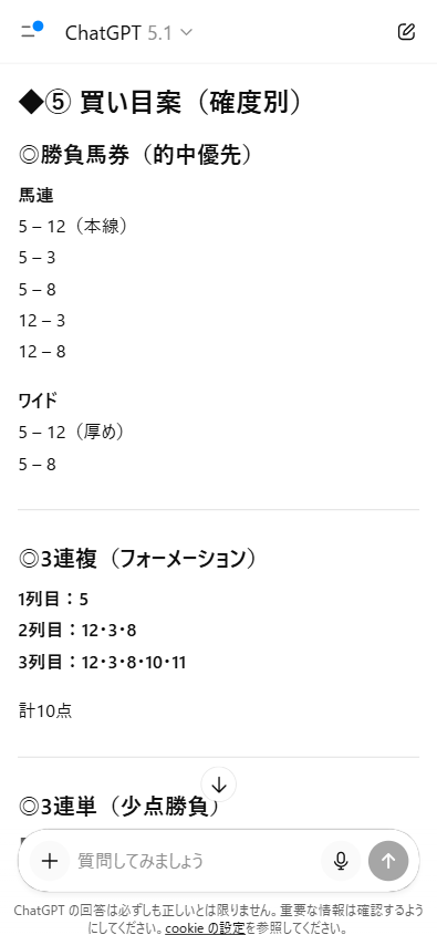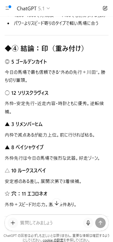 ChatGPTの特徴として、実力場を軸として中穴までは狙えますが、このような大荒れの場合はなかなか当てられないのがデメリットですね…