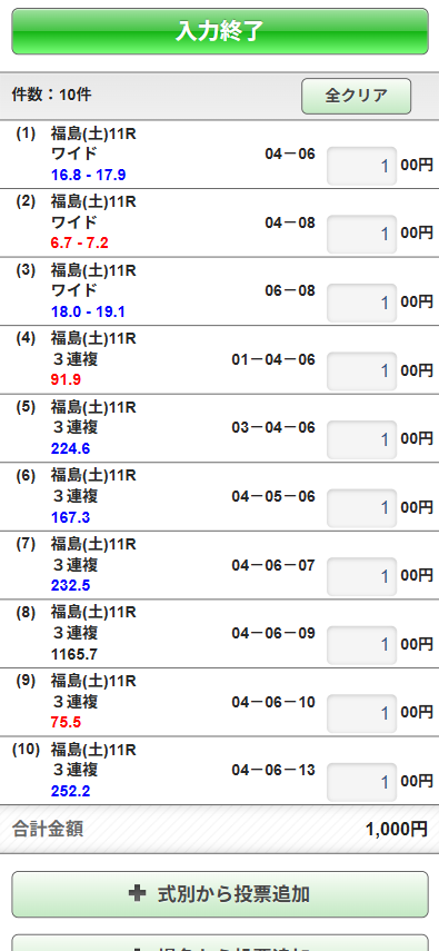 今回はこの買い方の中から、ワイドと3連複2頭軸流しを選択します。