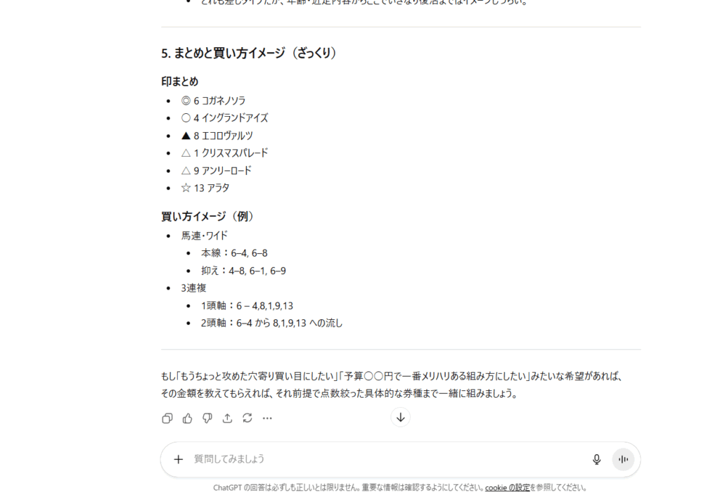 ChatGPTに馬場状況やコース傾向・各馬の実績を元にレース予想をしてもらいました。ChatGPTのようなAIで競馬予想する方法は以下の記事で詳しく解説しています。