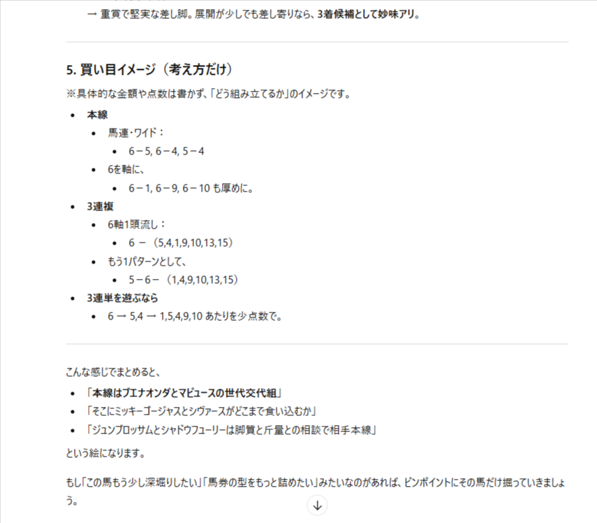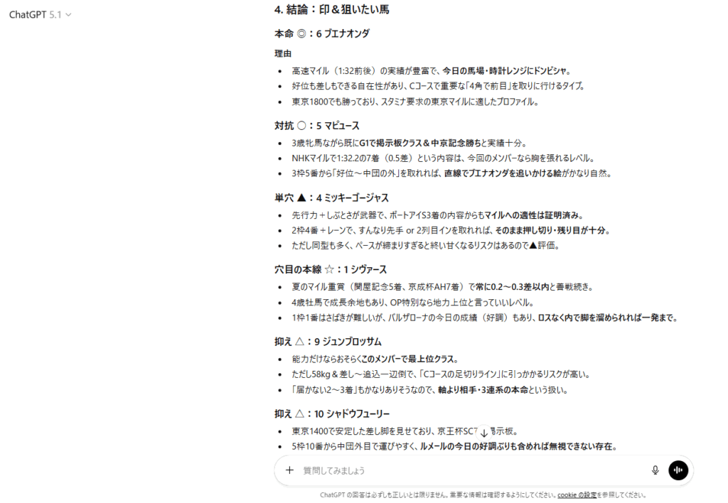 6番人気のブエナオンダブエナオンダが本命のようです。マイルの川田騎手が乗ってるのも期待できますね。続いて、ChatGPTの買い目を見てみましょう。